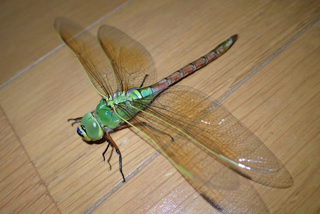 外観的には「ギンヤンマのメス」で間違いないだろう。そこそこトンボ系のサイトを調べてみたが、概ね体長が7-8cmとされている。コイツはとてもそんなサイズでは収まらない。